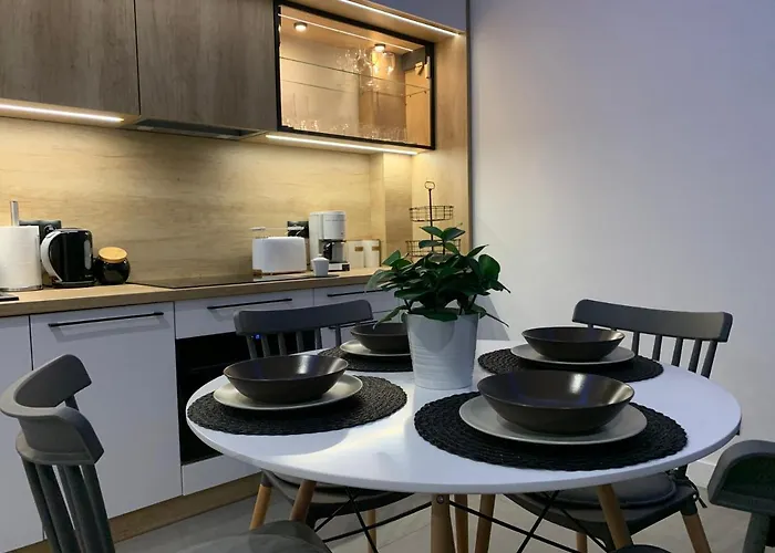 In einer kompletten Küche sorgen eine Mikrowelle, eine Kaffee-/Teemaschine und ein Kühlschrank für Ihren täglichen Komfort. Die Gäste des Apartments können einen komfortablen Aufenthalt genießen, da es Ausstattung zur Kaffee- & Teezubereitung gibt. Zu den Restaurants Cafe Molo und Bar Arka sind es ca. 5 Gehminuten. Die Fahrt zum internationalen Flughafen Stettin-Goleniow dauert etwa 55 Minuten mit dem Auto.